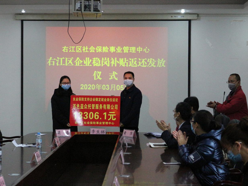 ??? 3月5日,在右江區(qū)社會保險事業(yè)管理中心召開穩(wěn)崗補貼返還工作會議暨企業(yè)穩(wěn)崗補貼返還發(fā)放儀式,我公司作為首批返還企業(yè)代表之一應邀參加,會上社保中心主任李生梯對我公司響應穩(wěn)崗補貼政策給予高度肯定,期望通過穩(wěn)崗補貼返還為公司的穩(wěn)定復產(chǎn)助力。截止目前,我公司有8家子公司符合享受失業(yè)保險穩(wěn)崗返還補貼條件,獲得穩(wěn)崗返還補貼3.6萬元,惠及企業(yè)員工約150人。(通訊員:黃 芬)