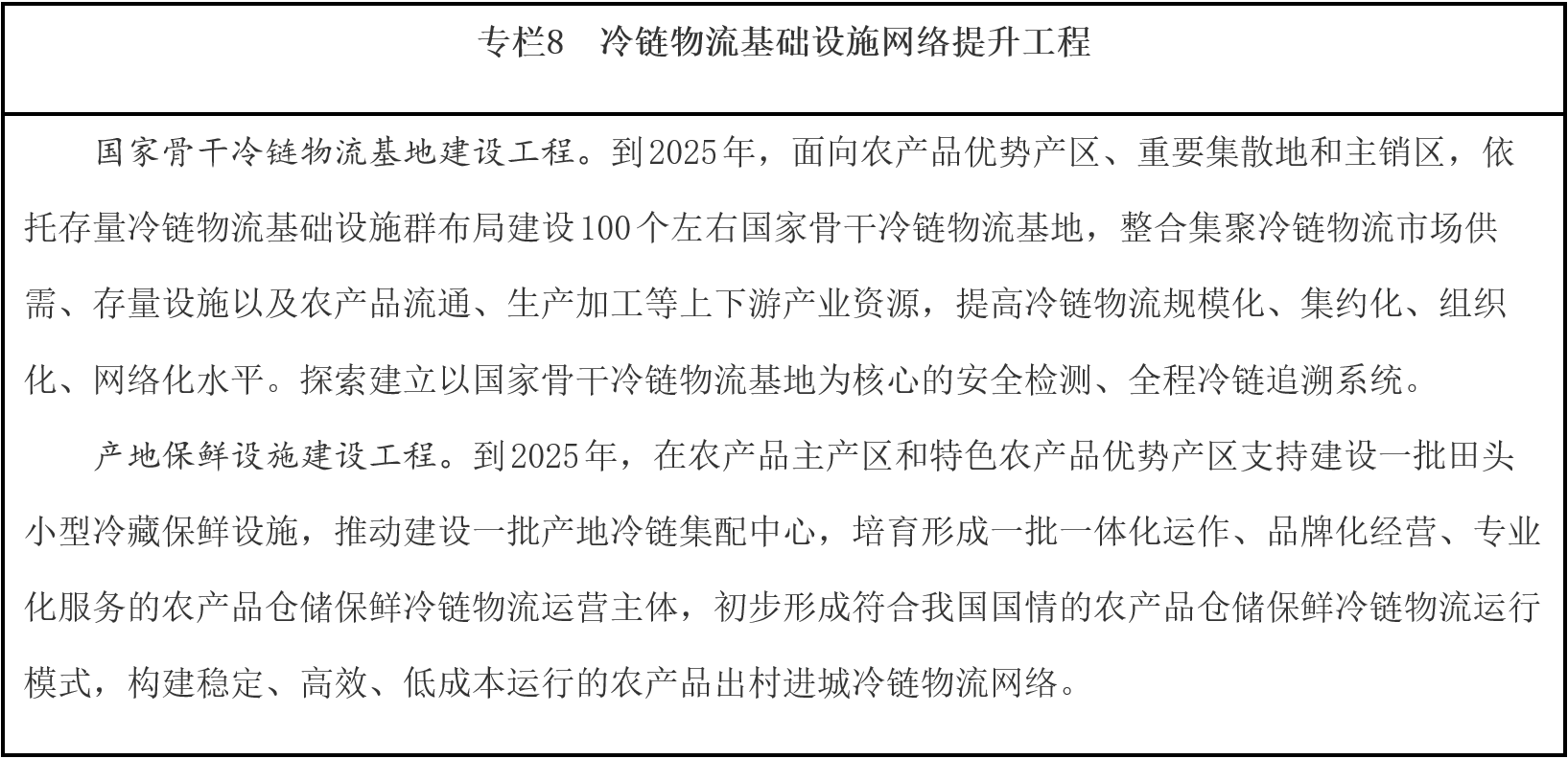 提高冷鏈物流質量效率。大力發(fā)展鐵路冷鏈運輸和集裝箱公鐵水聯(lián)運,對接主要農產品產區(qū)和集散地,創(chuàng)新冷鏈物流干支銜接模式。發(fā)展“生鮮電商+產地直發(fā)”等冷鏈物流新業(yè)態(tài)新模式。推廣蓄冷箱、保溫箱等單元化冷鏈載器具和標準化冷藏車,促進冷鏈物流信息互聯(lián)互通,提高冷鏈物流規(guī)模化、標準化水平。依托國家骨干冷鏈物流基地、產銷冷鏈集配中心等大型冷鏈物流設施,加強生鮮農產品檢驗檢疫、農獸藥殘留及防腐劑、保鮮劑、添加劑合規(guī)使用等質量監(jiān)管。研究推廣應用冷鏈道路運輸電子運單,加強產品溯源和全程溫濕度監(jiān)控,將源頭至終端的冷鏈物流全鏈條納入監(jiān)管范圍,提升冷鏈物流質量保障水平。健全進口冷鏈食品檢驗檢疫制度,筑牢疫情外防輸入防線。
