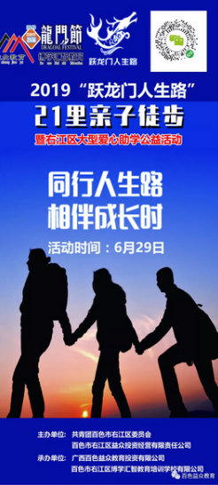 2019年百色市首屆龍門節(jié)暨右江區(qū)大型愛心助學(xué)公益活動(dòng)第三場—“躍龍門人生路”親子徒步活動(dòng)將于6月29日舉行,徒步全程10.5公里。活動(dòng)目的是為了更好地傳播“家庭+傳承+親子”的價(jià)值理念,以徒步的形式延伸出孩子成長路上的每個(gè)階段,徒步的背后蘊(yùn)含著一個(gè)永不言棄的家庭奮斗精神。活動(dòng)報(bào)名費(fèi)用50元/家庭(含2家長+1孩子或者1家長+2孩子),所有報(bào)名費(fèi)用由共青團(tuán)百色市右江區(qū)委員會(huì)捐贈(zèng)給右江區(qū)建檔立卡的貧困家庭學(xué)生。報(bào)名參與長按海報(bào)上二維碼識(shí)別繳費(fèi)即可,歡迎廣大學(xué)生家長踴躍參與。