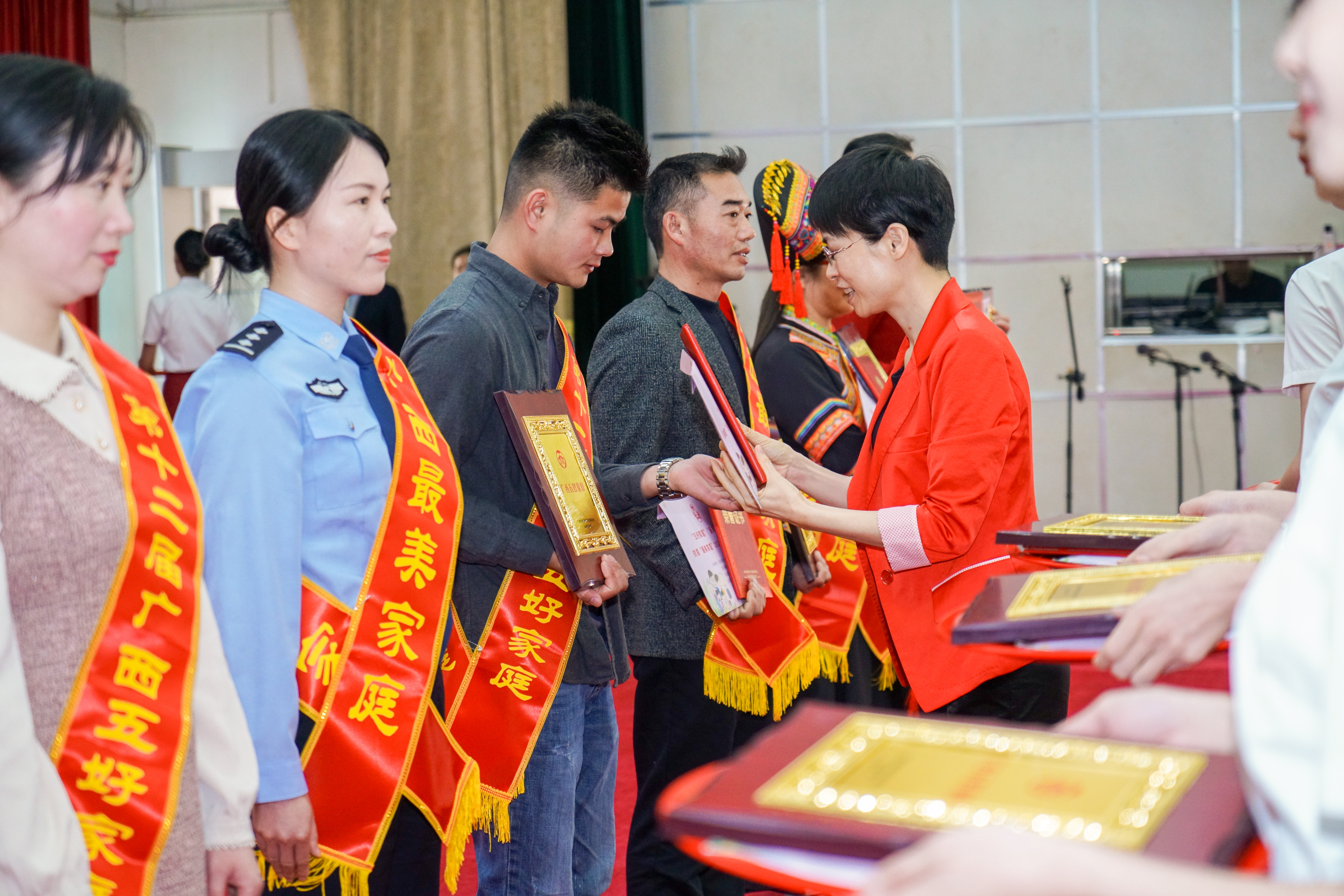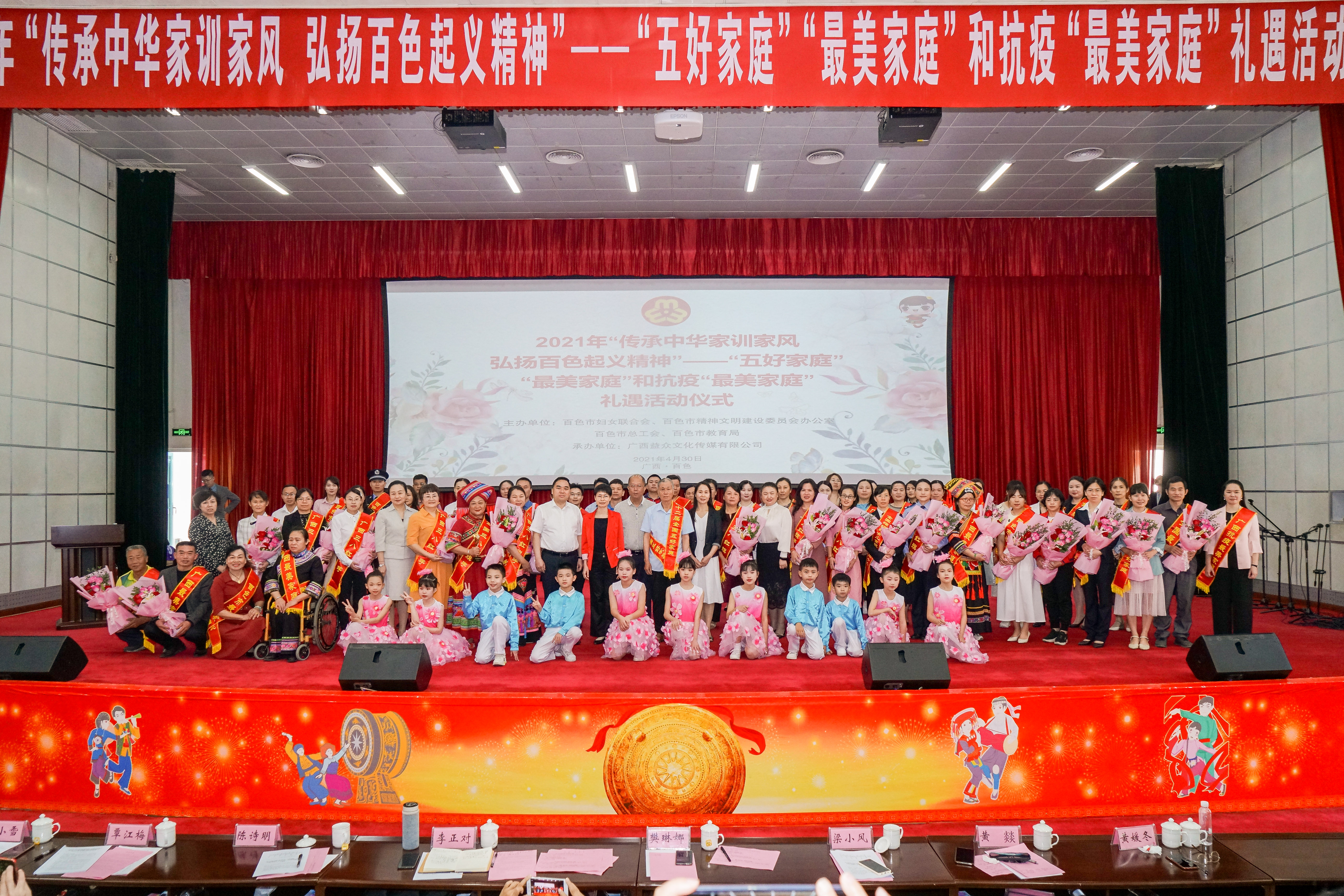 ????????為弘揚中華民族家庭美德、樹立良好家風、激勵抗疫精神,落實全國婦聯(lián)、自治區(qū)婦聯(lián)關于開展尋找“最美家庭”活動精神。4月30日,由百色市婦聯(lián)、市文明辦、市總工會、市教育局聯(lián)合舉辦,廣西益眾文化傳媒有限公司承辦的2021年“傳承中華家訓家風?弘揚百色起義精神”——“五好家庭”“最美家庭”和抗疫“最美家庭”禮遇活動儀式在右江區(qū)禮堂舉行。來自2020年“五好家庭”“最美家庭”和抗疫“最美家庭”代表、“最美家庭”禮遇愛心單位代表以及百色市市直機關、企事業(yè)單位和社會各界代表等共計200多人參加活動。