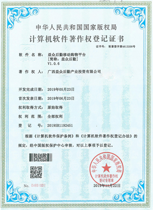 前,經(jīng)中國(guó)版權(quán)保護(hù)中心審核由益眾后勤司提交的《益眾后勤移動(dòng)購(gòu)物平臺(tái)》符合《計(jì)算機(jī)軟件保護(hù)條例》和《計(jì)算機(jī)軟件著作權(quán)登記辦法》的相關(guān)規(guī)定,被認(rèn)定為原始取得,并獲得中華人民共和國(guó)國(guó)家版權(quán)局頒發(fā)的《計(jì)算機(jī)軟件著作權(quán)登記證書(shū)》