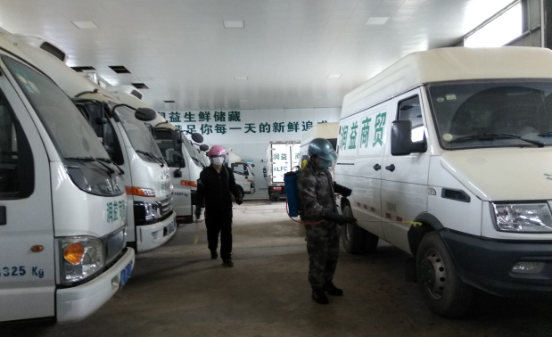 潤益商貿(mào)公司工作人員正在消毒配送車輛?