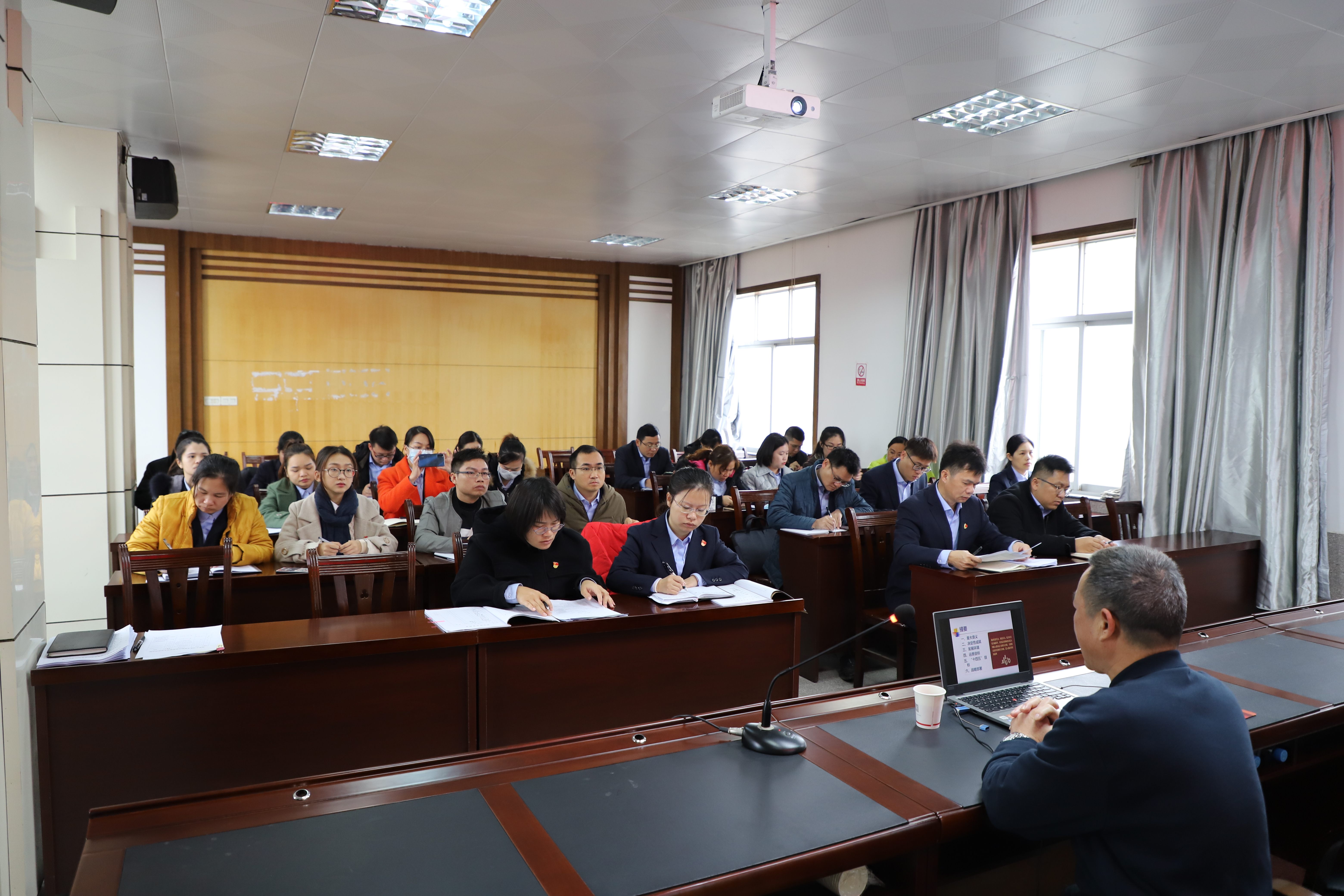 ????????右江區(qū)宣講團(tuán)黨的十九屆五中全會(huì)精神宣講報(bào)告會(huì)益眾公司專場近日舉行,宣講團(tuán)成員、區(qū)委黨校講師易祖文作宣講報(bào)告。公司領(lǐng)導(dǎo)干部、黨員、入黨積極分子約30人聆聽報(bào)告。