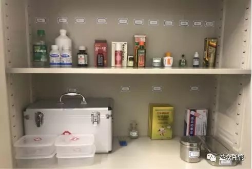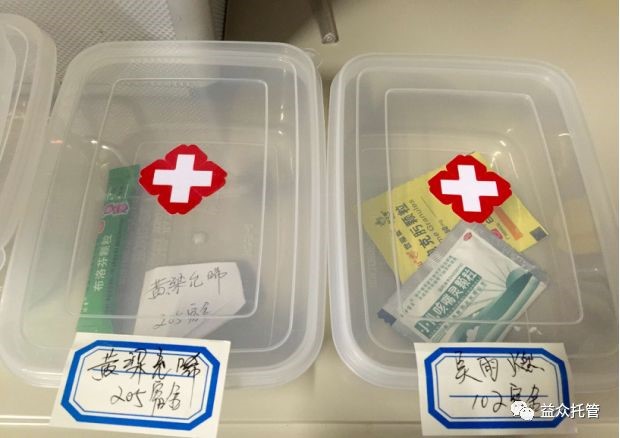 校區(qū)醫(yī)療角還專門設(shè)立了放置生病學(xué)生從家里帶來學(xué)校服用的藥品,每位學(xué)生按標(biāo)簽標(biāo)好,密封放置藥盒中,確保藥品不混淆、不受潮,按家長要求照顧孩子按時(shí)按量服藥。