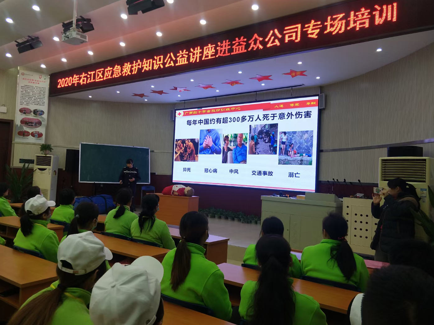 ????????為普及應(yīng)急救護知識,提高員工安全防范意識、自救互救能力和應(yīng)急救護技能,12月2日、6日,益眾公司邀請百色市右江區(qū)紅十字會到公司開展急救知識技能培訓(xùn),公司百余名管理人員、有關(guān)直屬班組400余人參加培訓(xùn)。