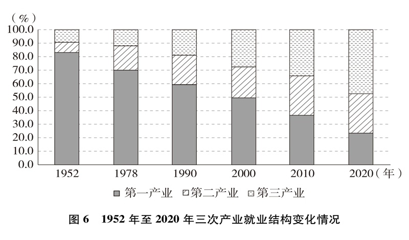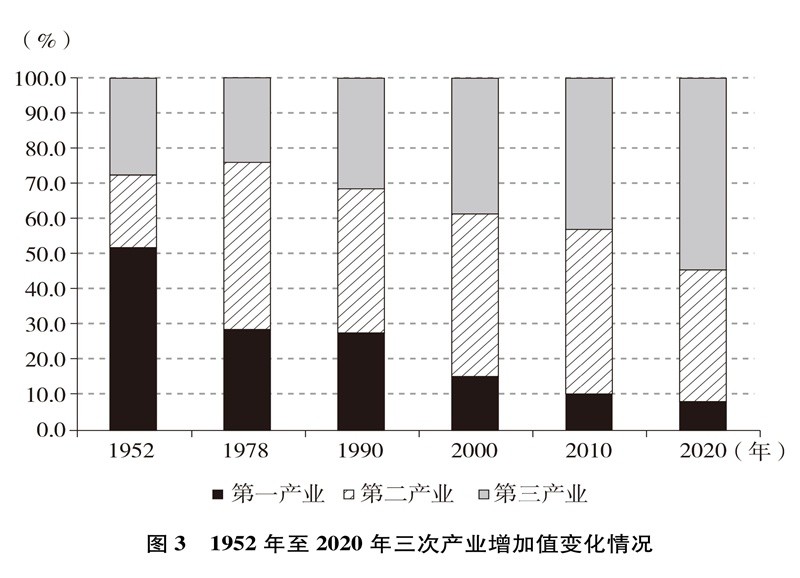 產(chǎn)業(yè)結(jié)構(gòu)優(yōu)化升級(jí)。中國已建成世界上最完整的產(chǎn)業(yè)體系,產(chǎn)業(yè)發(fā)展持續(xù)向中高端邁進(jìn)。三次產(chǎn)業(yè)增加值之比從1952年的50.5∶20.8∶28.7到2020年的7.7∶37.8∶54.5,中國從傳統(tǒng)農(nóng)業(yè)大國成為工業(yè)大國、服務(wù)業(yè)大國(圖3),中國經(jīng)濟(jì)從依賴單一產(chǎn)業(yè)為主轉(zhuǎn)向依靠三次產(chǎn)業(yè)共同帶動(dòng)。農(nóng)業(yè)現(xiàn)代化成效顯著,機(jī)械化、數(shù)字化、綠色化、功能化、共享化水平明顯提高,廣大農(nóng)民逐步告別“面朝黃土背朝天、一身力氣百身汗”的辛勞,農(nóng)村生產(chǎn)力極大解放;糧食生產(chǎn)能力穩(wěn)步提升,實(shí)現(xiàn)谷物基本自給,中國人把飯碗牢牢端在自己手中。中國建成門類齊全、獨(dú)立完整的現(xiàn)代工業(yè)體系,工業(yè)化和信息化融合發(fā)展的廣度和深度不斷拓展,“中國制造”向“中國智造”轉(zhuǎn)型升級(jí),產(chǎn)業(yè)鏈供應(yīng)鏈現(xiàn)代化水平進(jìn)一步提升。以新一代信息技術(shù)、生物技術(shù)、高端裝備、綠色環(huán)保為代表的戰(zhàn)略性新興產(chǎn)業(yè)發(fā)展迅速,成為引領(lǐng)高質(zhì)量發(fā)展的重要引擎。數(shù)字經(jīng)濟(jì)激發(fā)經(jīng)濟(jì)發(fā)展新活力,產(chǎn)業(yè)數(shù)字化和數(shù)字產(chǎn)業(yè)化趨勢加快。現(xiàn)代服務(wù)業(yè)加速發(fā)展,以“互聯(lián)網(wǎng)+”為標(biāo)志的新業(yè)態(tài)、新模式層出不窮,平臺(tái)經(jīng)濟(jì)、共享經(jīng)濟(jì)蓬勃興起,生產(chǎn)性服務(wù)業(yè)向?qū)I(yè)化和高端化發(fā)展,生活性服務(wù)業(yè)向精細(xì)化和高品質(zhì)轉(zhuǎn)變。產(chǎn)業(yè)結(jié)構(gòu)的優(yōu)化升級(jí)促進(jìn)了經(jīng)濟(jì)更加均衡、更加充分的發(fā)展,人們個(gè)性化品質(zhì)化多樣化需求不斷得到滿足。