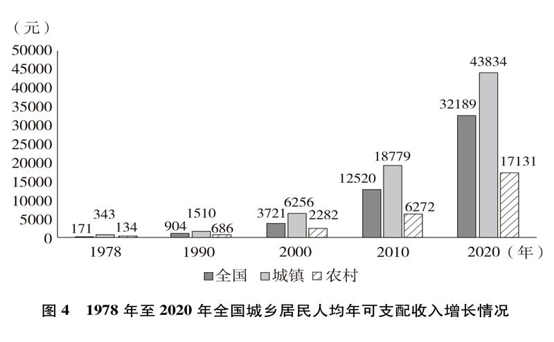 人民生活水平顯著提高。居民收入持續(xù)增加,全國居民人均年可支配收入從1978年的171元增加到2020年的32189元(圖4)。城鄉(xiāng)居民恩格爾系數(shù)分別從1978年的57.5%、67.7%下降到2020年的29.2%、32.7%(圖5),城鄉(xiāng)居民生活質(zhì)量不斷提升。溫飽問題解決后,人們對生活品質(zhì)、品位有了更高的追求,衣食住行不斷升級(jí),消費(fèi)結(jié)構(gòu)從生存型逐漸向發(fā)展型、享受型過渡。衣,從穿暖到穿美、穿出時(shí)尚;食,從吃飽到吃好、吃出健康;住,從有所居到更敞亮、更宜居;行,從便利通暢到快捷舒適。吃穿用有余,家電全面普及,乘用汽車快速進(jìn)入尋常百姓家。餐飲、健康、教育、旅游、文娛等服務(wù)性消費(fèi)持續(xù)快速增長,在居民人均消費(fèi)支出中占比逐漸達(dá)到一半左右。越來越多的人有“錢”有“閑”,“詩和遠(yuǎn)方”更加觸手可及,“說走就走”不再是夢想,旅游扮靚人們的幸福生活,中國正在進(jìn)入大眾旅游時(shí)代。