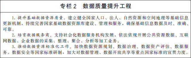 (一)強(qiáng)化高質(zhì)量數(shù)據(jù)要素供給。支持市場(chǎng)主體依法合規(guī)開(kāi)展數(shù)據(jù)采集,聚焦數(shù)據(jù)的標(biāo)注、清洗、脫敏、脫密、聚合、分析等環(huán)節(jié),提升數(shù)據(jù)資源處理能力,培育壯大數(shù)據(jù)服務(wù)產(chǎn)業(yè)。推動(dòng)數(shù)據(jù)資源標(biāo)準(zhǔn)體系建設(shè),提升數(shù)據(jù)管理水平和數(shù)據(jù)質(zhì)量,探索面向業(yè)務(wù)應(yīng)用的共享、交換、協(xié)作和開(kāi)放。加快推動(dòng)各領(lǐng)域通信協(xié)議兼容統(tǒng)一,打破技術(shù)和協(xié)議壁壘,努力實(shí)現(xiàn)互通互操作,形成完整貫通的數(shù)據(jù)鏈。推動(dòng)數(shù)據(jù)分類(lèi)分級(jí)管理,強(qiáng)化數(shù)據(jù)安全風(fēng)險(xiǎn)評(píng)估、監(jiān)測(cè)預(yù)警和應(yīng)急處置。深化政務(wù)數(shù)據(jù)跨層級(jí)、跨地域、跨部門(mén)有序共享。建立健全國(guó)家公共數(shù)據(jù)資源體系,統(tǒng)籌公共數(shù)據(jù)資源開(kāi)發(fā)利用,推動(dòng)基礎(chǔ)公共數(shù)據(jù)安全有序開(kāi)放,構(gòu)建統(tǒng)一的國(guó)家公共數(shù)據(jù)開(kāi)放平臺(tái)和開(kāi)發(fā)利用端口,提升公共數(shù)據(jù)開(kāi)放水平,釋放數(shù)據(jù)紅利。