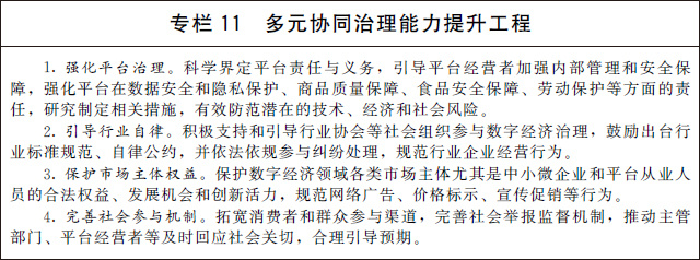 (三)完善多元共治新格局。建立完善政府、平臺(tái)、企業(yè)、行業(yè)組織和社會(huì)公眾多元參與、有效協(xié)同的數(shù)字經(jīng)濟(jì)治理新格局,形成治理合力,鼓勵(lì)良性競(jìng)爭(zhēng),維護(hù)公平有效市場(chǎng)。加快健全市場(chǎng)準(zhǔn)入制度、公平競(jìng)爭(zhēng)審查機(jī)制,完善數(shù)字經(jīng)濟(jì)公平競(jìng)爭(zhēng)監(jiān)管制度,預(yù)防和制止濫用行政權(quán)力排除限制競(jìng)爭(zhēng)。進(jìn)一步明確平臺(tái)企業(yè)主體責(zé)任和義務(wù),推進(jìn)行業(yè)服務(wù)標(biāo)準(zhǔn)建設(shè)和行業(yè)自律,保護(hù)平臺(tái)從業(yè)人員和消費(fèi)者合法權(quán)益。開(kāi)展社會(huì)監(jiān)督、媒體監(jiān)督、公眾監(jiān)督,培育多元治理、協(xié)調(diào)發(fā)展新生態(tài)。鼓勵(lì)建立爭(zhēng)議在線(xiàn)解決機(jī)制和渠道,制定并公示爭(zhēng)議解決規(guī)則。引導(dǎo)社會(huì)各界積極參與推動(dòng)數(shù)字經(jīng)濟(jì)治理,加強(qiáng)和改進(jìn)反壟斷執(zhí)法,暢通多元主體訴求表達(dá)、權(quán)益保障渠道,及時(shí)化解矛盾糾紛,維護(hù)公眾利益和社會(huì)穩(wěn)定。