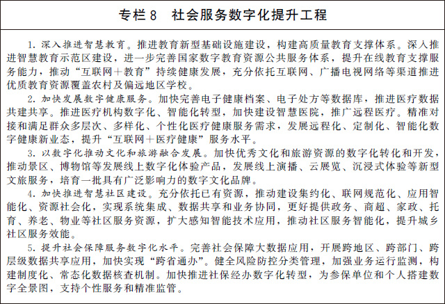 (二)提升社會(huì)服務(wù)數(shù)字化普惠水平。加快推動(dòng)文化教育、醫(yī)療健康、會(huì)展旅游、體育健身等領(lǐng)域公共服務(wù)資源數(shù)字化供給和網(wǎng)絡(luò)化服務(wù),促進(jìn)優(yōu)質(zhì)資源共享復(fù)用。充分運(yùn)用新型數(shù)字技術(shù),強(qiáng)化就業(yè)、養(yǎng)老、兒童福利、托育、家政等民生領(lǐng)域供需對(duì)接,進(jìn)一步優(yōu)化資源配置。發(fā)展智慧廣電網(wǎng)絡(luò),加快推進(jìn)全國(guó)有線(xiàn)電視網(wǎng)絡(luò)整合和升級(jí)改造。深入開(kāi)展電信普遍服務(wù)試點(diǎn),提升農(nóng)村及偏遠(yuǎn)地區(qū)網(wǎng)絡(luò)覆蓋水平。加強(qiáng)面向革命老區(qū)、民族地區(qū)、邊疆地區(qū)、脫貧地區(qū)的遠(yuǎn)程服務(wù),拓展教育、醫(yī)療、社保、對(duì)口幫扶等服務(wù)內(nèi)容,助力基本公共服務(wù)均等化。加強(qiáng)信息無(wú)障礙建設(shè),提升面向特殊群體的數(shù)字化社會(huì)服務(wù)能力。促進(jìn)社會(huì)服務(wù)和數(shù)字平臺(tái)深度融合,探索多領(lǐng)域跨界合作,推動(dòng)醫(yī)養(yǎng)結(jié)合、文教結(jié)合、體醫(yī)結(jié)合、文旅融合。