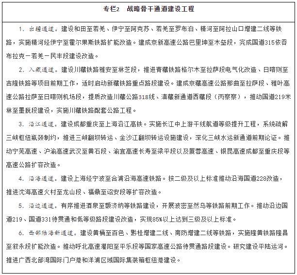 加強戰(zhàn)略骨干通道建設。推進出疆入藏通道建設,擴大甘新、青新、青藏、川藏四條內(nèi)聯(lián)主通道通行能力,穩(wěn)步推進川藏鐵路建設,加快推進新藏鐵路和田至日喀則段前期工作、適時啟動重點路段建設,有序推進滇藏鐵路前期工作,密實優(yōu)化航空航線網(wǎng)絡布局,構(gòu)建多向聯(lián)通的通道布局。暢通沿江通道,加快建設沿江高鐵,優(yōu)化以高等級航道和干線鐵路、高速公路為骨干的沿江綜合運輸大通道功能。升級沿海通道,提高鐵路通道能力,推進高速公路繁忙路段擴容改造,提升港口航道整體效能,構(gòu)建大容量、高品質(zhì)的運輸走廊。貫通沿邊通道,提級改造普通國省干線,推進重點方向沿邊鐵路建設,提高安全保障水平。建設西部陸海新通道,發(fā)揮鐵路在陸路運輸中的骨干作用和港口在海上運輸中的門戶作用,強化東、中、西三條通路,形成大能力主通道,銜接國際運輸通道。