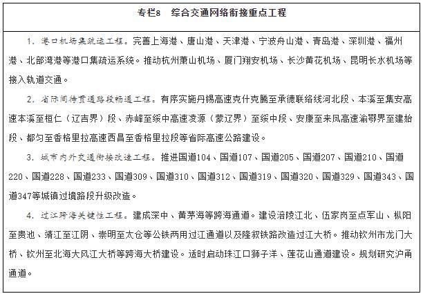 加快解決制約人民美好出行、貨物高效流通的瓶頸,強化綜合交通網(wǎng)絡有機銜接。打通公路省際待貫通路段,加強干線公路與城市道路有效銜接,推進城鎮(zhèn)密集地區(qū)干線公路過境段、進出城瓶頸路段升級改造。加強樞紐機場與軌道交通高效銜接,使換乘更加便捷。強化進港區(qū)、進園區(qū)、進廠區(qū)、進規(guī)模化農(nóng)產(chǎn)品基地等集疏運設施建設,加快推動鐵路進港口重點港區(qū)和大型工礦企業(yè)、物流園區(qū)、重點物資儲備庫。統(tǒng)籌考慮資源高效利用、生態(tài)環(huán)境保護和防洪航運安全,有序建設各種運輸方式共享通道資源的過江跨海通道。推動超大特大城市的大型綜合客運樞紐間通過軌道交通互連。加快實現(xiàn)聯(lián)系緊密的綜合貨運樞紐間通過聯(lián)絡線或?qū)S猛ǖ阑ミB。