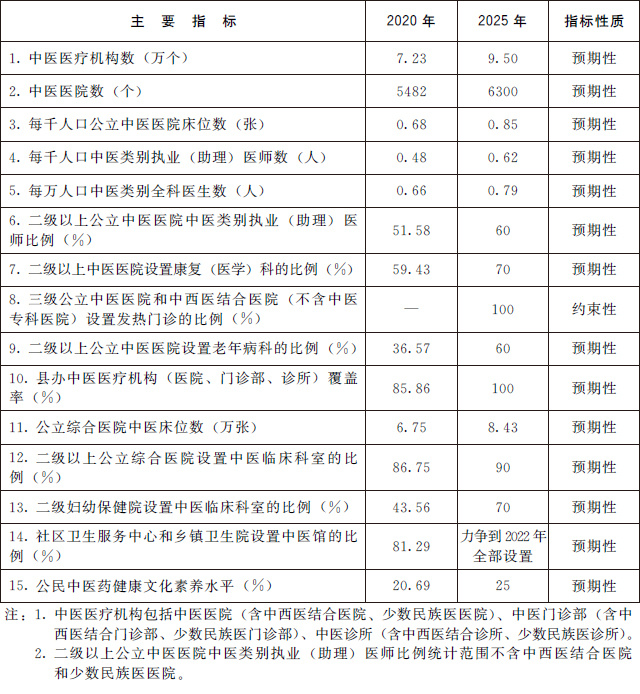 (三)發(fā)展目標(biāo)。到2025年,中醫(yī)藥健康服務(wù)能力明顯增強,中醫(yī)藥高質(zhì)量發(fā)展政策和體系進(jìn)一步完善,中醫(yī)藥振興發(fā)展取得積極成效,在健康中國建設(shè)中的獨特優(yōu)勢得到充分發(fā)揮。