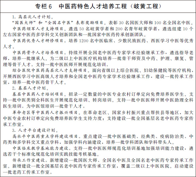 2.強化中醫(yī)藥特色人才隊伍建設(shè)。實施中醫(yī)藥特色人才培養(yǎng)工程(岐黃工程)。打造岐黃學(xué)者品牌,持續(xù)開展岐黃學(xué)者培養(yǎng)、全國中醫(yī)臨床優(yōu)秀人才研修等項目,做強領(lǐng)軍人才、優(yōu)秀人才、骨干人才梯次銜接的高層次人才隊伍。建設(shè)一批高水平中醫(yī)藥重點學(xué)科。構(gòu)建符合中醫(yī)藥特點的人才培養(yǎng)模式,發(fā)展中醫(yī)藥師承教育,建立高年資中醫(yī)醫(yī)師帶徒制度,與職稱評審、評優(yōu)評先等掛鉤,持續(xù)推進(jìn)全國名老中醫(yī)藥專家傳承工作室、全國基層名老中醫(yī)藥專家傳承工作室建設(shè)。將綜合醫(yī)院、婦幼保健院等醫(yī)療機構(gòu)中醫(yī)藥人才納入各類中醫(yī)藥人才培養(yǎng)項目。按照“下得去、留得住、用得上”的要求,加強基層中醫(yī)藥人才隊伍建設(shè),根據(jù)需求合理確定中醫(yī)專業(yè)農(nóng)村訂單定向免費培養(yǎng)醫(yī)學(xué)生規(guī)模,在全科醫(yī)生特崗計劃中積極招收中醫(yī)醫(yī)師。推廣中醫(yī)藥人員“縣管鄉(xiāng)用”,探索推進(jìn)輪崗制與職稱評審相銜接。適當(dāng)放寬長期服務(wù)基層的中醫(yī)醫(yī)師職稱晉升條件,表彰獎勵評優(yōu)向基層一線和艱苦地區(qū)傾斜,引導(dǎo)中醫(yī)藥人才向基層流動。